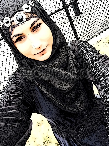Young Beautiful Muslim Woman in Traditional Hijab and black Garment (an Abaya, a loose-fitting full-length robe worn by some Muslim women).